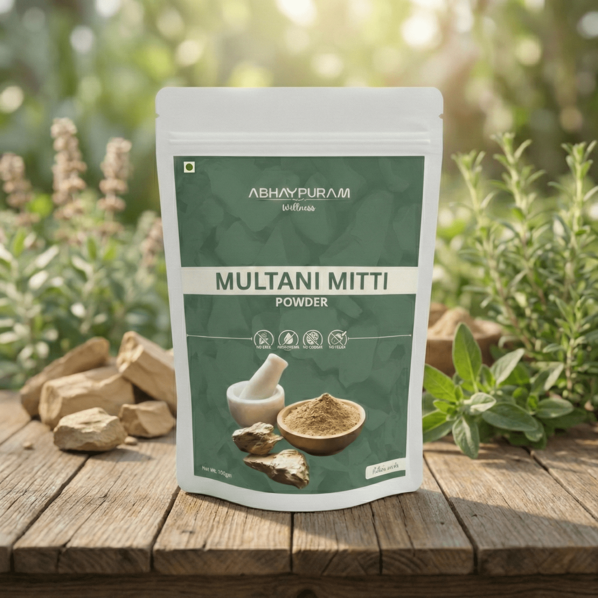 Abhaypuram Wellness Multani Mitti Powder brings you this ancient natural treasure in its purest and most authentic form. Carefully sourced, finely processed, and hygienically packed, our Multani Mitti Powder is designed to support natural skin clarity, oil balance, and scalp health—without the use of harmful chemicals or synthetic additives.
