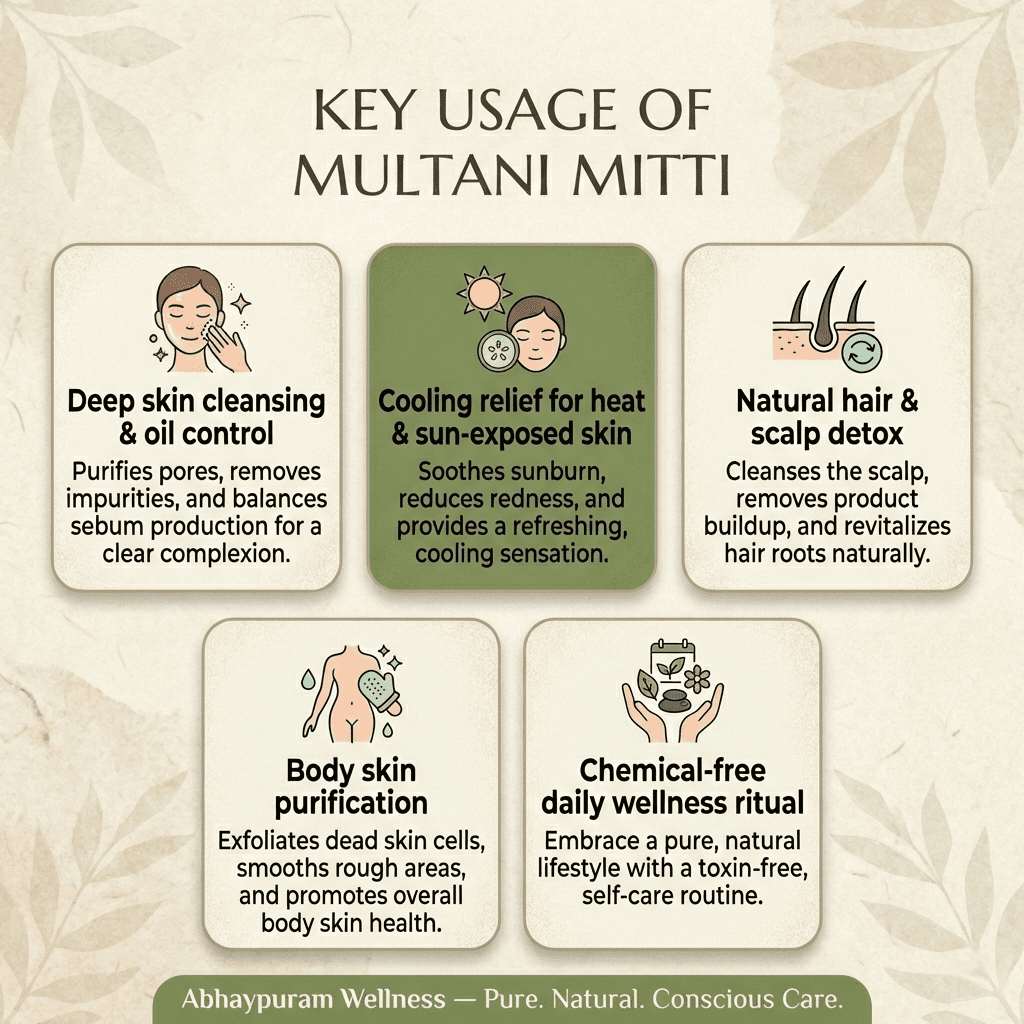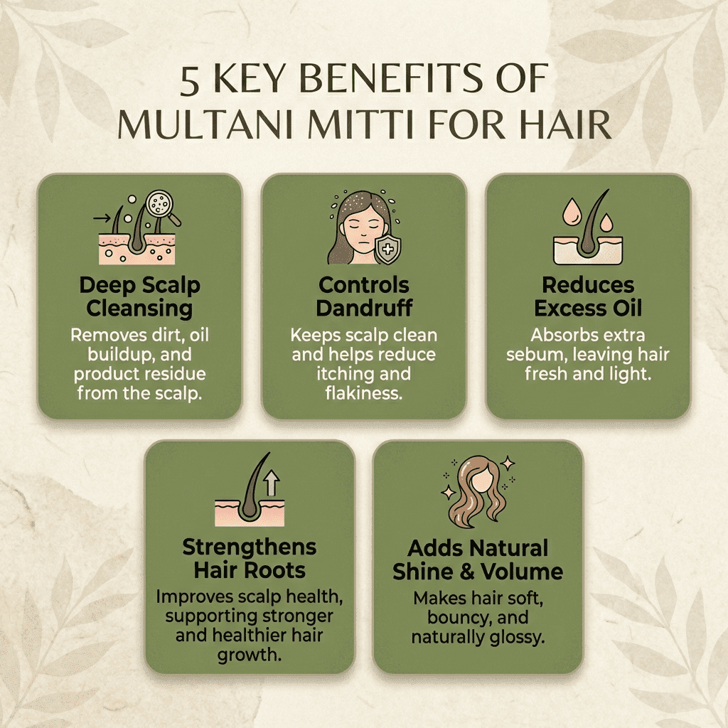 Beyond skincare, Multani Mitti has long been used as a natural hair and scalp cleanser. It provides a gentle yet effective way to maintain scalp hygiene and improve hair health without relying on harsh chemical shampoos.